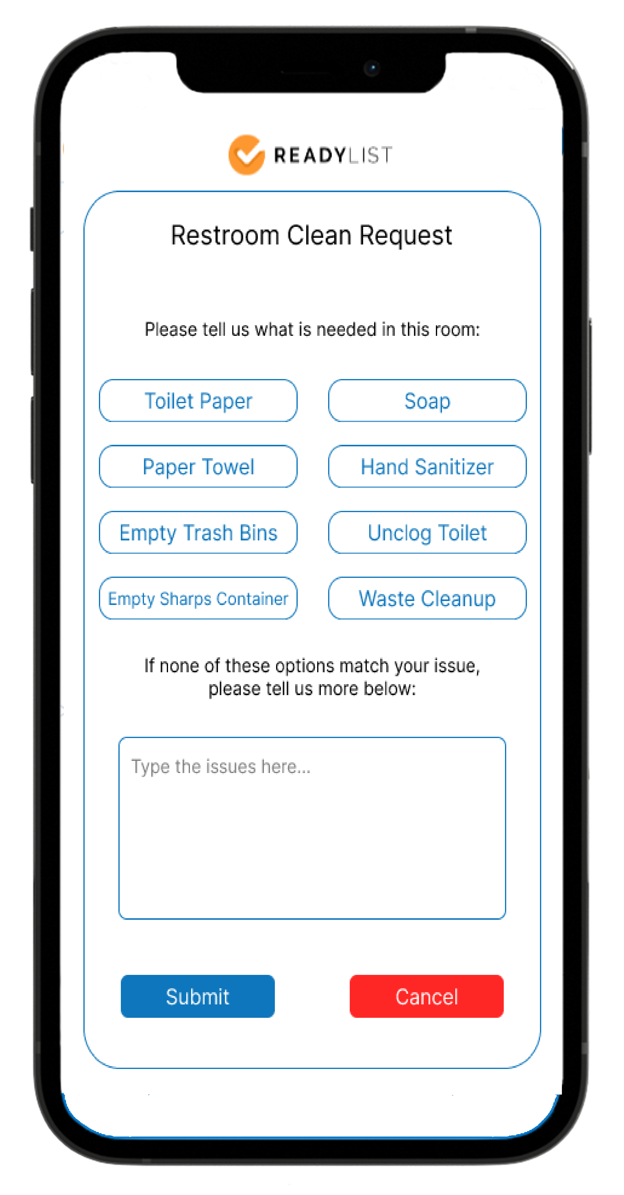 After simply scanning a QR code, hospital visitors and staff can choose from a selection of common issues that arise in your restrooms and public spaces, while also allowing for a more detailed description if necessary.